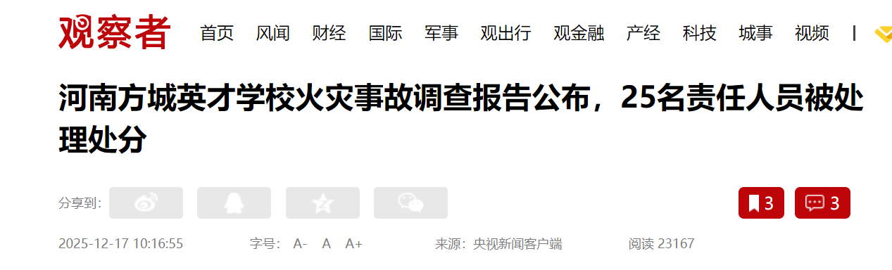 12月17日,河南省发布方城县英才学校重大火灾事故调查报告。经调查认定,该起事故系起火宿舍内一名小学生使用打火机时,引燃宿舍衣服、床铺等物品并迅速蔓延造成的重大火灾。记者从有关部门获悉,河南省纪检监察机关依规依纪依法对履行职责不力、监督管理不到位的25名责任人员作出严肃处理处分。