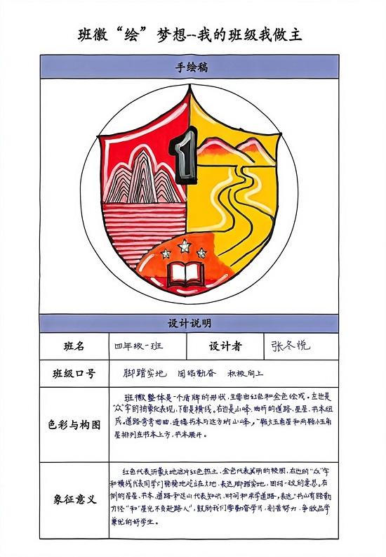学生纷纷化身“小小设计师”,围绕“如何设计体现班级精神的班徽”这一驱动问题,开展头脑风暴,提炼班级精神,运用色彩、图形与象征手法,将对班级的热爱凝练为独特视觉符号。