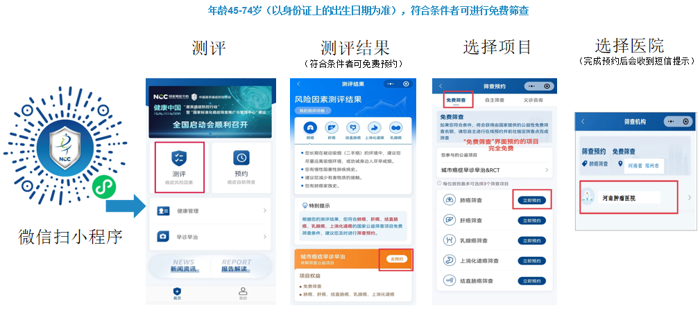 该项目2012年启动,河南省从2013年开始参与该项目。18岁以上河南常住居民通过扫码进入“中国居民癌症防控行动”小程序,即可进行癌症风险因素测评;对风险测评后符合条件的45岁~74岁居民,提供免费筛查;其他年龄段居民也可通过小程序自费预约筛查。