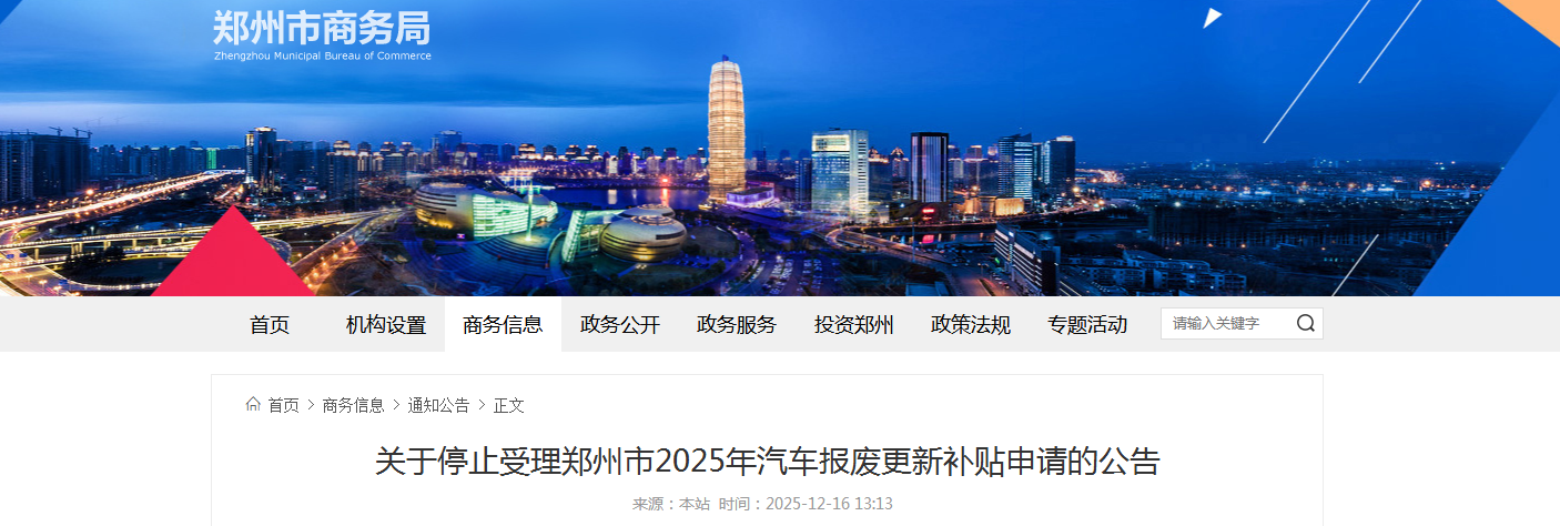 12月16日,郑州市商务局发布《关于停止受理郑州市2025年汽车报废更新补贴申请的公告》,具体公告如下:
