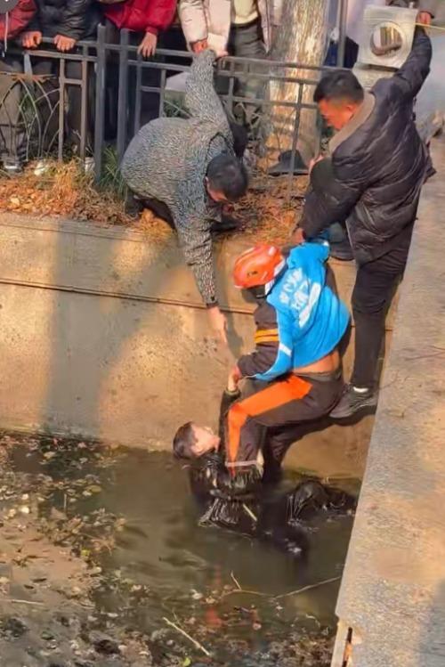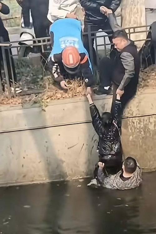 视频显示,一名身穿黑衣服的小男孩漂在河沟里,岸上一名身穿制服的外卖员和另外几位市民合力施救。外卖员抓住栏杆,在众人拉拽下将腿伸进水里,试图进行救援。随后,一名男子跳进水里,将男孩托举,外卖员和岸上其他市民合力将男孩拉了上来。