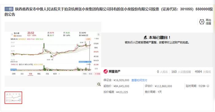 阿里资产平台上的竞买公告显示,富春控股集团有限公司管理人将于12月23日10时至12月24日10时止(延时除外)在淘宝网阿里拍卖破产强清平台上进行杭州张小泉集团有限公司名下车牌号为浙AE39G6小型轿车公开拍卖活动。