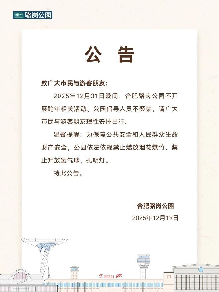 大皖新闻讯 12月19日,合肥滨湖科学城城市空间运营管理有限公司通过“合肥骆岗公园”微信公众号发布公告,称2025年12月31日晚间,合肥骆岗公园不开展跨年相关活动。