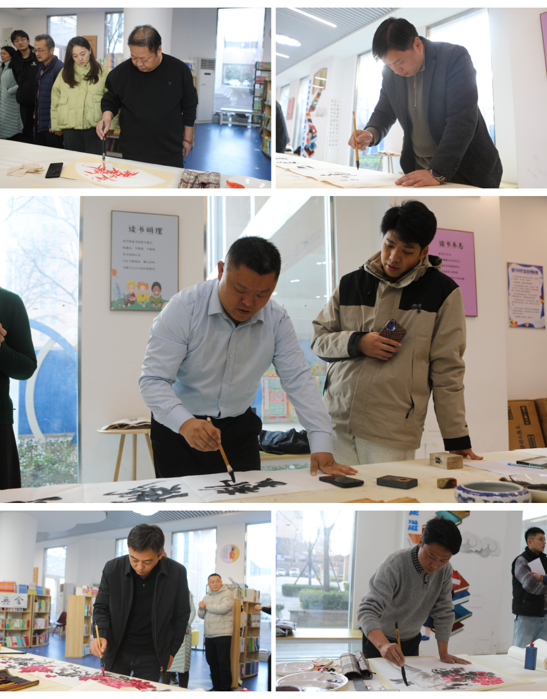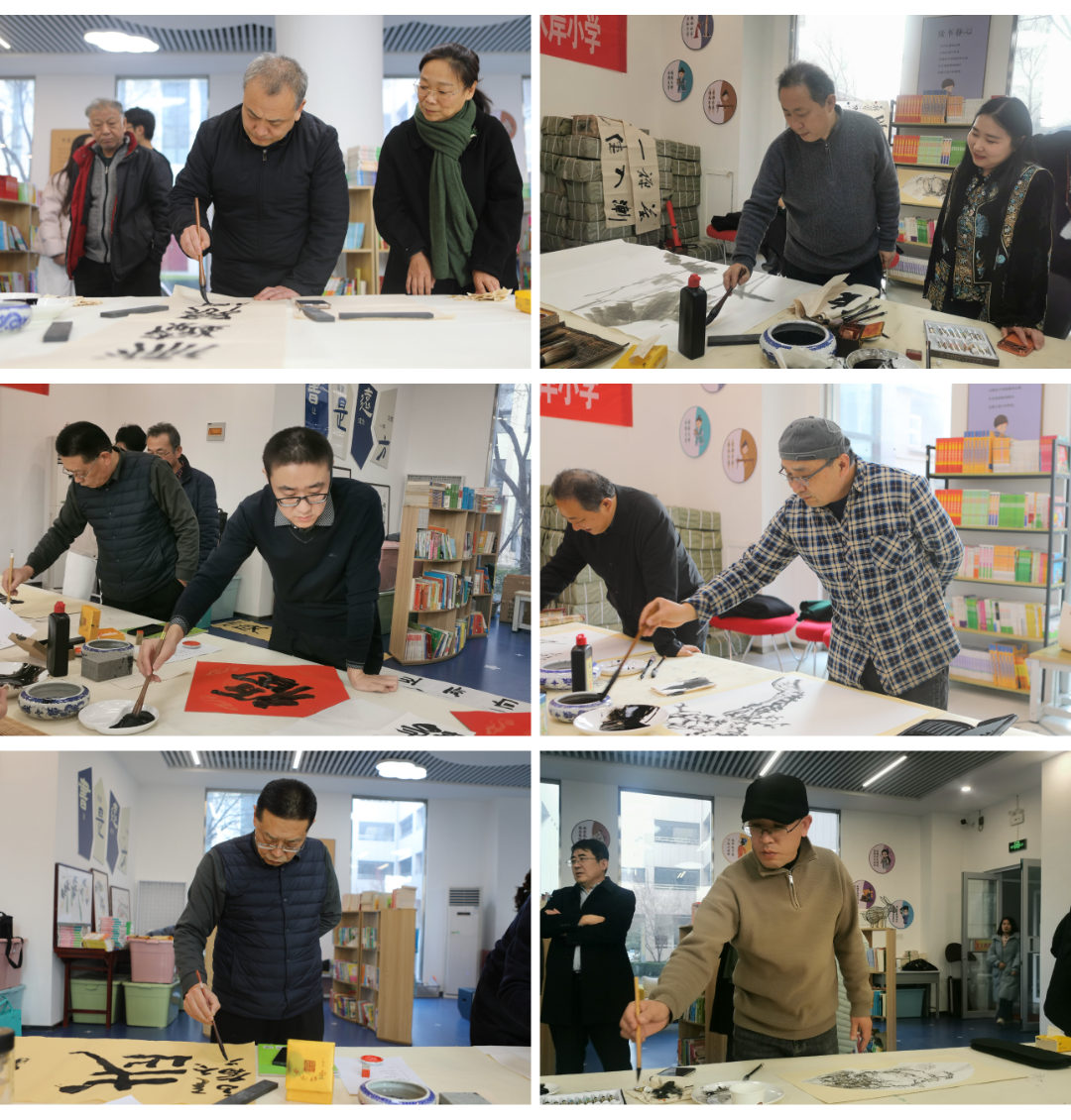笔会雅集在校园蔚蓝书屋内温馨展开。书画名家们挥毫泼墨,共同创作。书法家们以笔墨传递汉字之美,画家则以色彩勾勒山河意境。创作间隙,学校教师代表环绕观摩,结合教学实际提出关于艺术技法与美育融入课堂的疑问,艺术家们一一悉心解答。整个互动过程生动亲切,让在场师生直观感受到艺术创作的魅力与中华文化的深厚底蕴。
