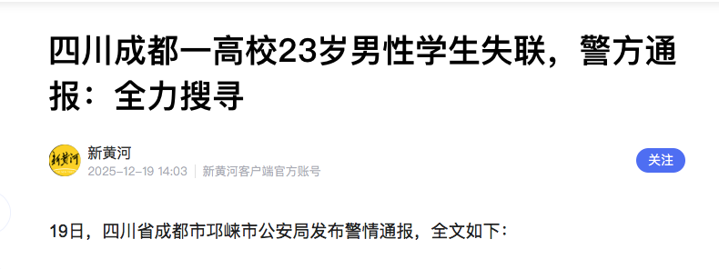 2025年12月14日16时29分,我局羊安派出所接胡某报警称:其侄子刘某某(男,23岁,四川邛崃市人,成都某高校学生)于2025年12月11日离开学校后失联,请求帮助。