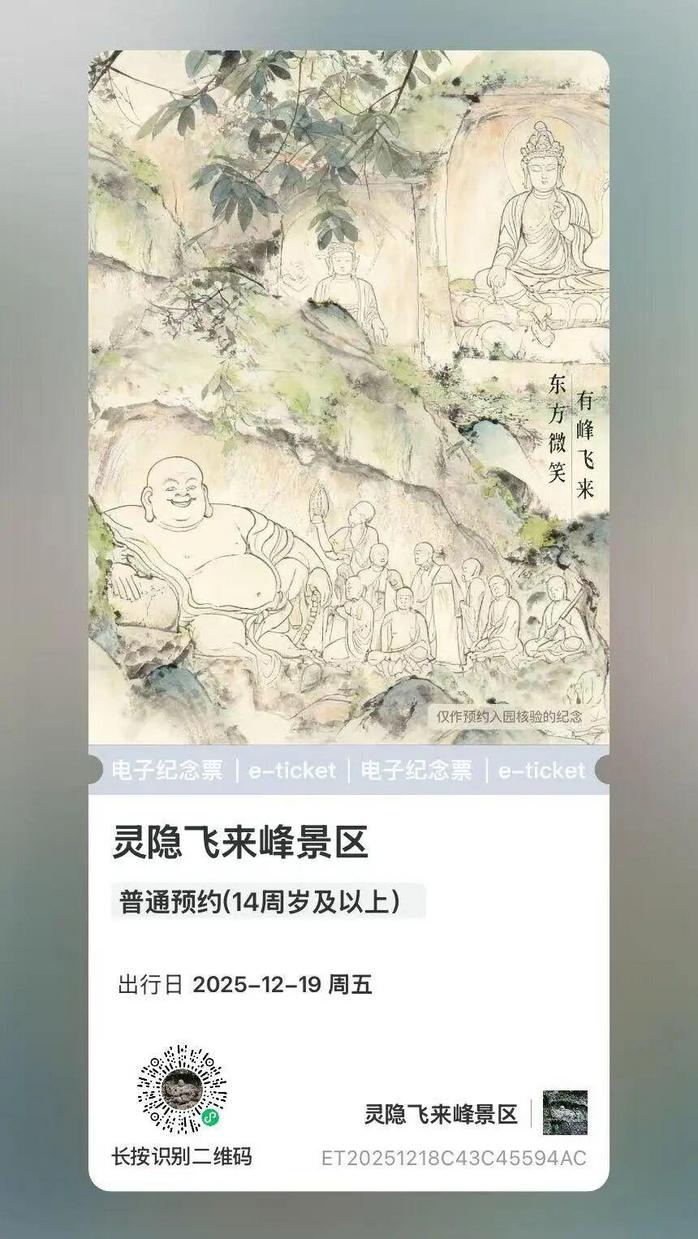 为提升游览体验,灵隐飞来峰景区近期推出了电子纪念票。游客通过线上平台预约并入园后,可在预约平台的订单记录中保存一张精美的电子纪念票(非卖品)。纪念票票面以飞来峰造像中最具代表性的“布袋弥勒及十八罗汉造像”为主体,融合石窟艺术、幽深林壑等文化意象设计而成,满足游客的留念需求,同时推广石窟文化。
