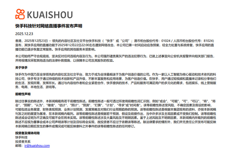 12月23日,快手发布声明称,快手应用的直播功能于2025年12月22日22:00左右遭到网络攻击,本公司已第一时间启动应急预案,经全力处置与系统修复,快手应用的直播功能已逐步恢复正常服务。快手应用的其他服务未受影响。