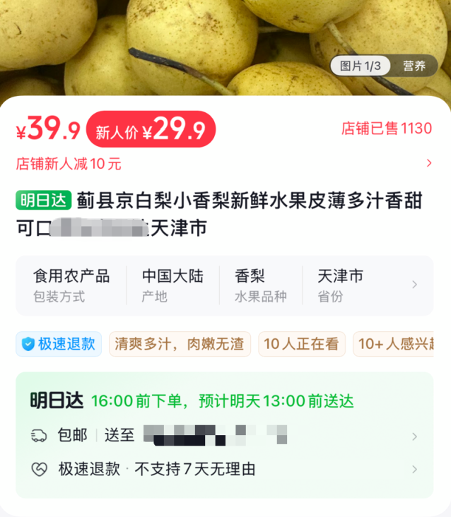 上平台大量标注“京白梨”的产品,产地和发货地均不在北京。