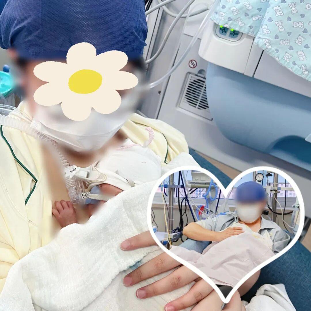 为了小哥俩更好地发育,NICU救治团队在他们撤离有创呼吸机后即开始了床旁袋鼠式护理。这是独属于他们的亲子时光,当爸爸妈妈第一次一人拥一个小宝贝在怀,二人激动地落泪。
