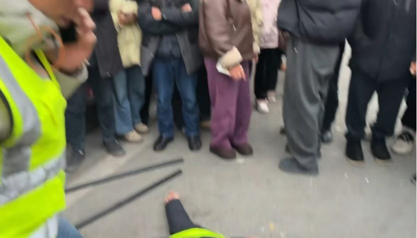 视频中,一名身着荧光背心的男子躺倒在地,嘴唇发白,双眼闭合,疑似失去意识,周围围了不少人。