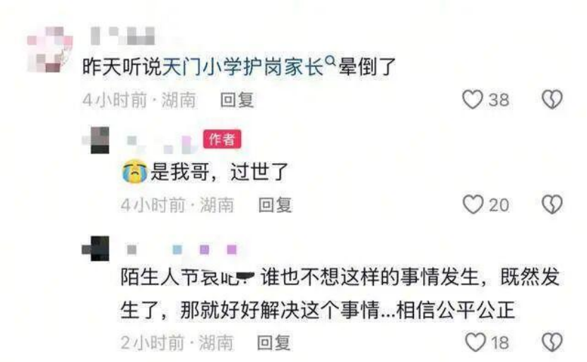 华商报大风新闻记者注意到,有自称倒地男子妹妹的网友说,倒地男子已离世,年龄45岁,她正连夜赶回去。评论区中,有网友提及天门小学护学岗有家长倒地一事,该网友回复称“是我哥,过世了”。