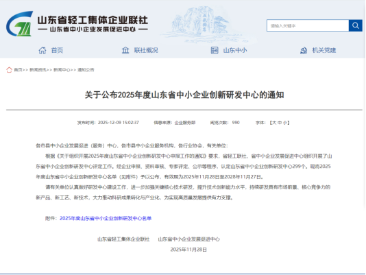 鲁网12月30日讯近日,山东省轻工集体企业联社(山东省中小企业发展促进中心)公布2025年山东省中小企业创新研发中心名单,青岛核工机械有限公司凭借深厚技术积累与创新能力,经过严格评审,成功认定为“山东省中小企业创新研发中心”。