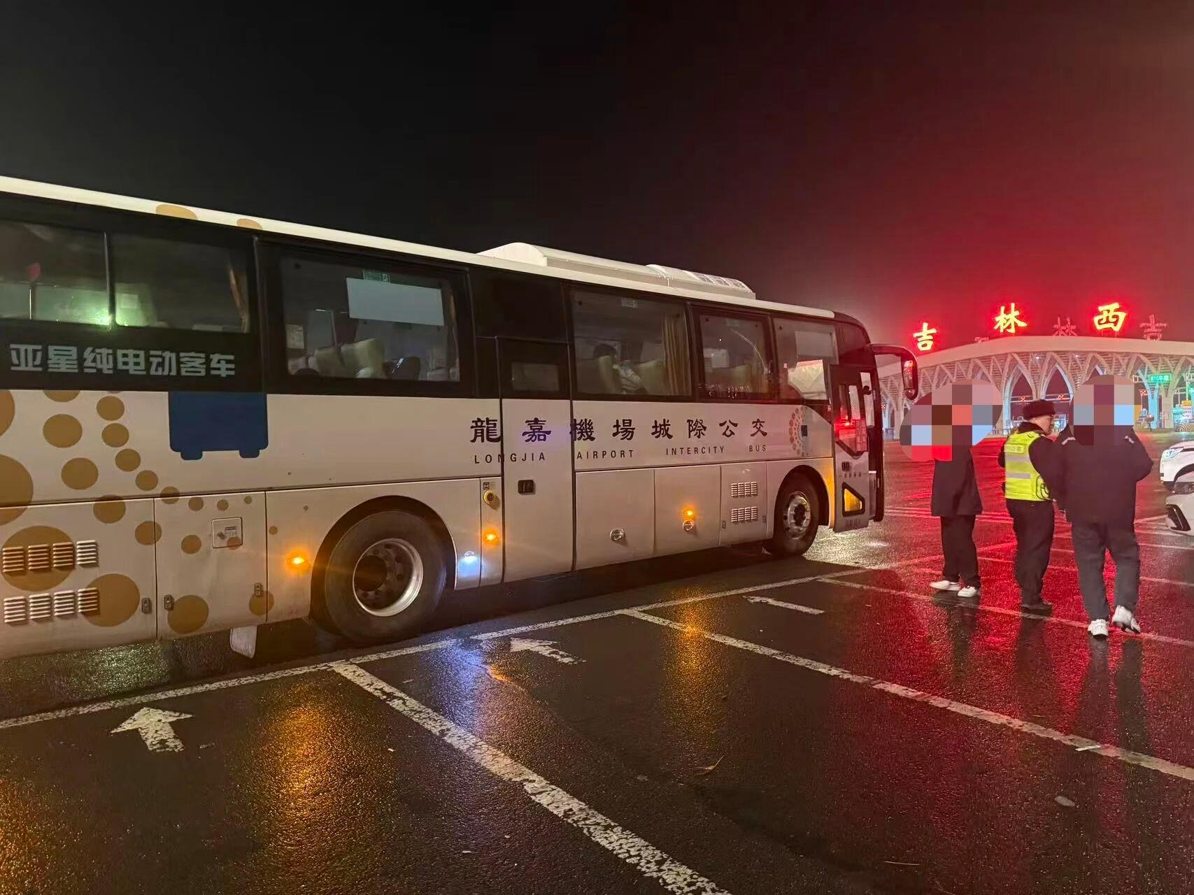 近日,吉林省公安厅交通管理总队高速公路吉林支队巡逻二大队民警在吉林西高速收费站执勤时,接到两辆吉林市至长春龙嘉国际机场大巴车的求助。此时,受天气影响,吉林市至龙嘉机场的高速路段路面湿滑,大巴车高速行驶存在安全隐患,而车上旅客均急需赶赴机场乘机,时间十分紧急。