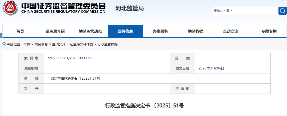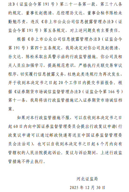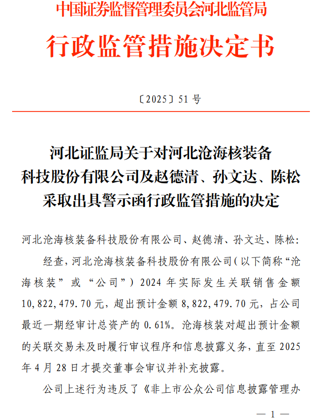 河北沧海核装备科技股份有限公司(简称:沧海核装,证券代码:833491)因关联交易未及时履行审议程序和信息披露,于2025年12月30日收到河北证监局下达的关于《行政监管措施决定书〔2025〕51号》,沧海核装及董事长赵德清等三人被出具警示函。