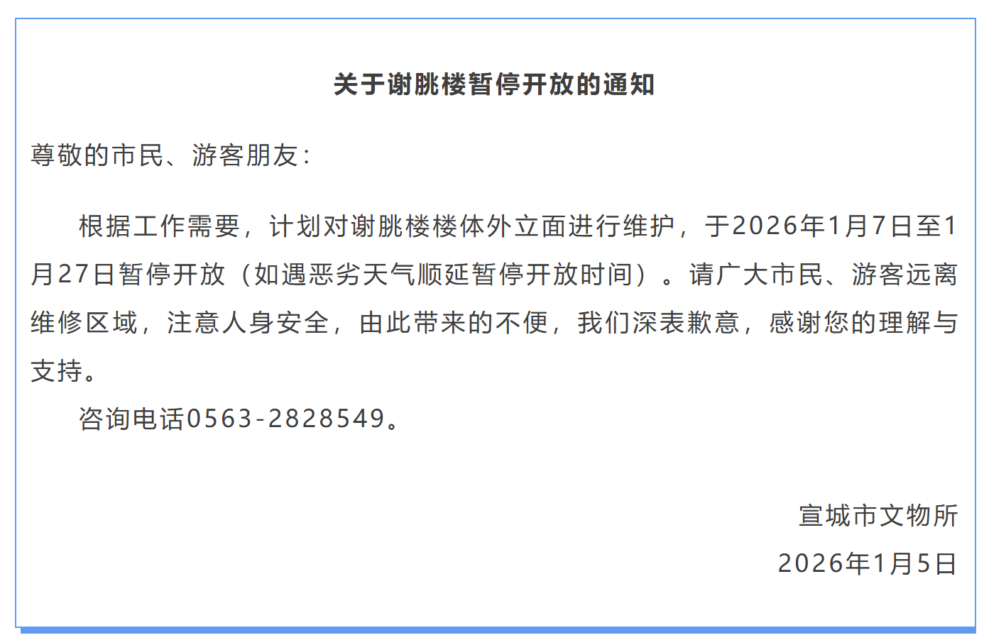 大皖新闻讯 1月5日,宣城市文物所发布通知称,根据工作需要,计划对谢朓楼楼体外立面进行维护,于2026年1月7日至1月27日暂停开放(如遇恶劣天气顺延暂停开放时间)。请广大市民、游客远离维修区域,注意人身安全。