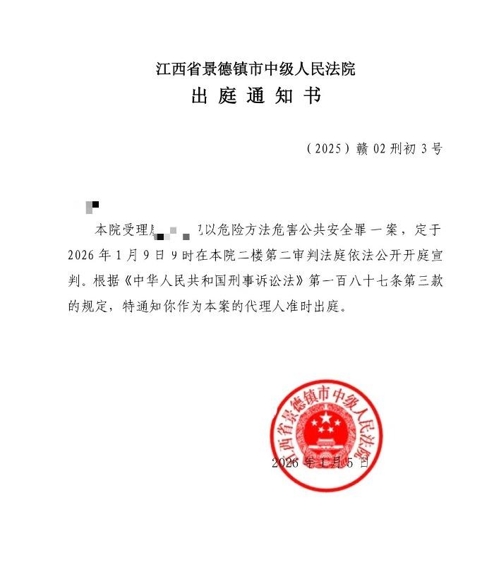 大皖新闻讯 1月5日,备受关注的“景德镇一家三口被撞身亡”案迎来最新进展。死者的至亲胡女士告诉大皖新闻记者,他们已收到江西省景德镇市中级人民法院的出庭通知书,廖某某犯以危险方法危害公共安全罪一案,定于1月9日9时在景德镇中院第二审判法庭依法公开开庭宣判。