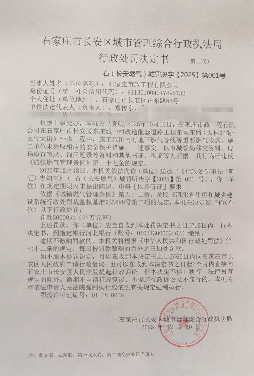 文号“石(长安燃气)城罚决字【2025】第001号”行政处罚决定书显示,2025年10月16日,石家庄市政工程有限公司在石家庄市长安区东庄城中村改造配套道路工程东垣东路(天桂北街-太行大街)排水工程中,施工范围内有地下燃气管线等重要燃气设施,施工单位未采取相应的安全保护措施。