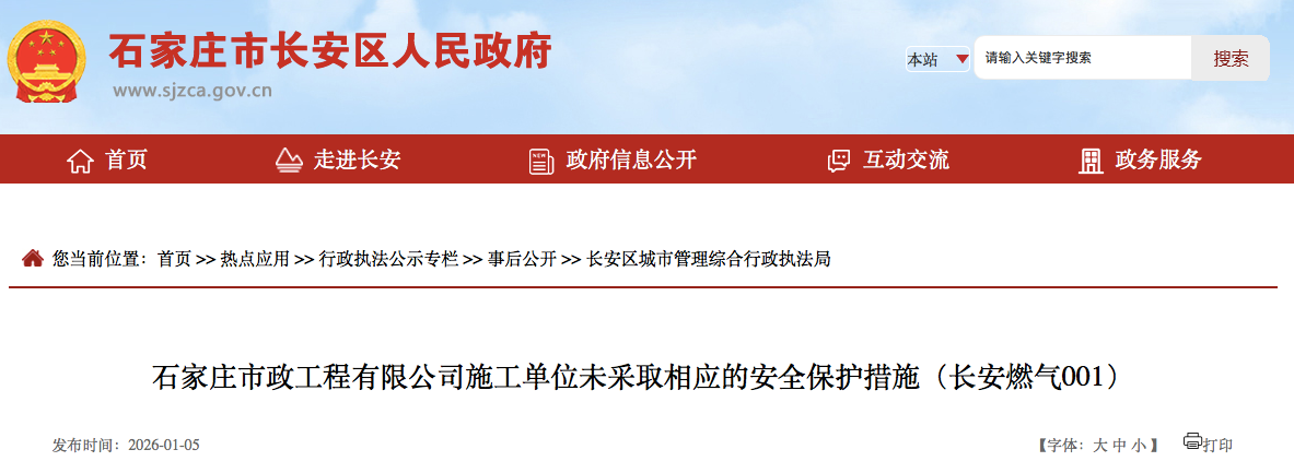 2026年1月5日,石家庄市长安区人民政府官网发布了一则行政处罚信息,施工单位未采取相应的安全保护措施,石家庄市政工程有限公司被长安区城市管理综合行政执法局罚款3万元。