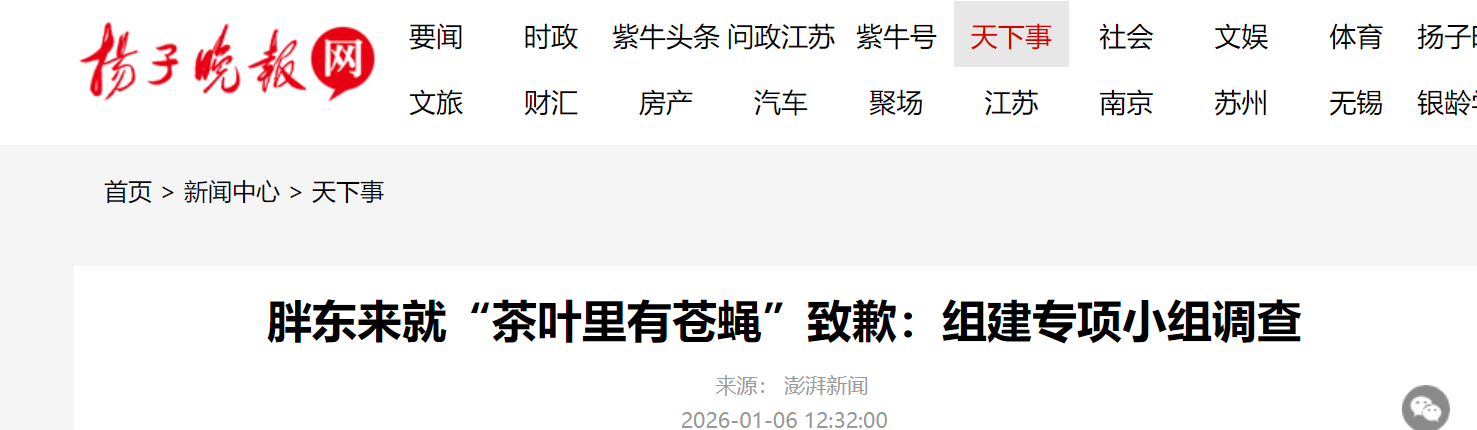 针对有顾客反馈“胖东来茶叶有苍蝇”一事,1月5日下午,胖东来公开发布情况说明称,公司立即组建以集团轮值组成的专项调查小组调查落实,对顾客真诚表达歉意。