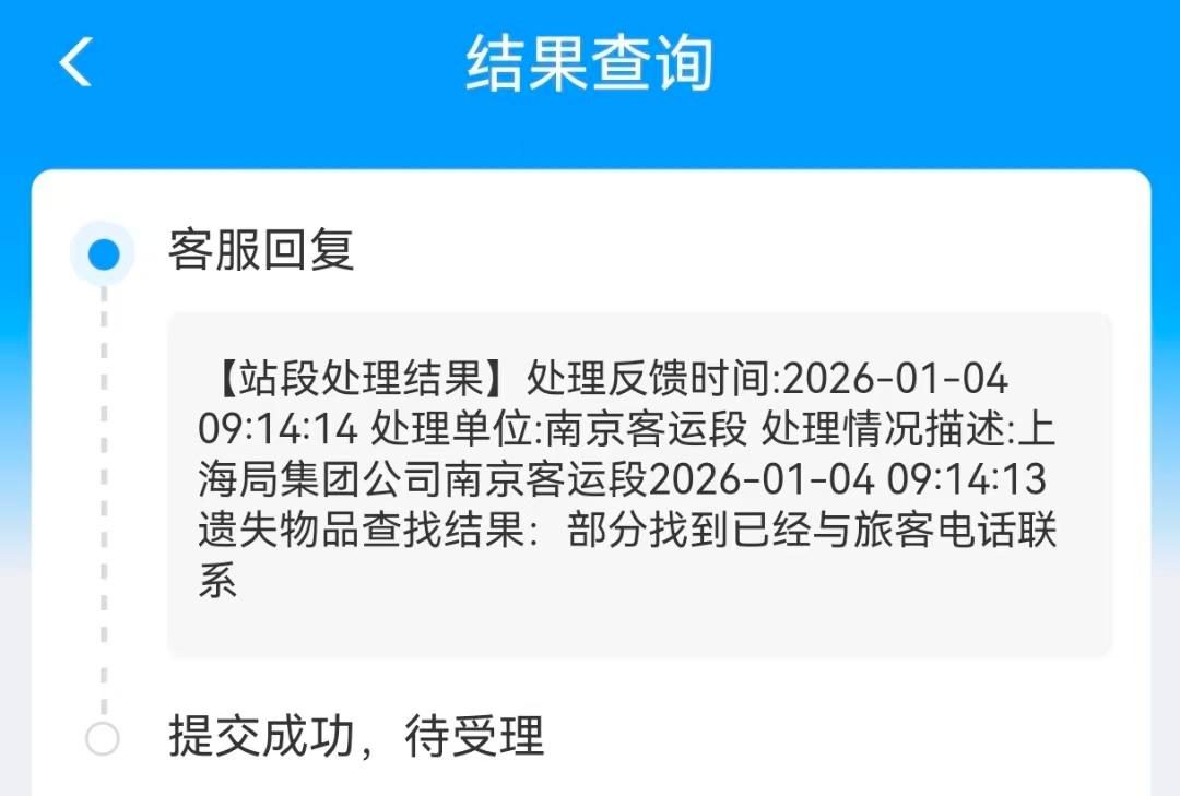1月4日,客服回复苏女士称,上海局集团公司南京客运段反馈遗失物品查找结果:部分找到已经与旅客电话联系。寻找状态是发现相关物品,1月6日,大皖新闻记者通过12306客服热线证实了这一处理进展。