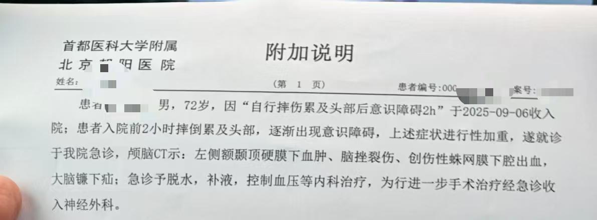 小航说,随后他意识到父亲的情况十分严重,于是赶紧将父亲送到了首都医科大学附属北京朝阳医院,“第一次CT显示脑部出血,之后病情迅速恶化,陷入昏迷。医生判断情况变得更加严重,又做了第二次CT,确诊为脑疝。当天傍晚6点,接受去骨瓣减压术,头部巴掌大的骨头因粉碎性骨折被取出。”