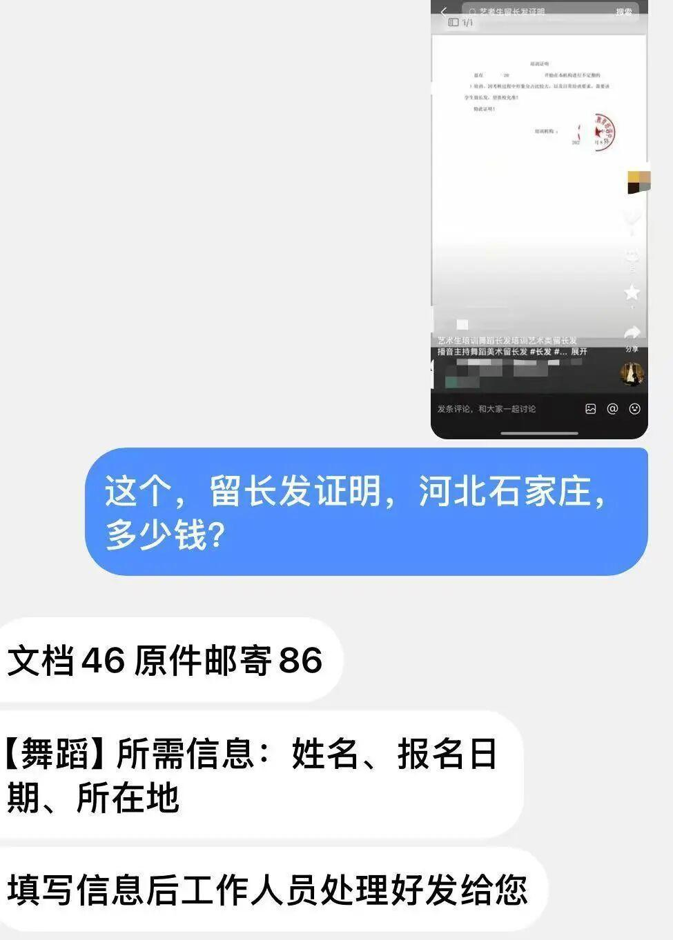 记者查询发现,网络中有专门开具“留发证明”的相关渠道。记者以消费者身份咨询,对方表示需要提供姓名、报名日期、所在地,费用为一份文档46元,原件邮寄86元。(极目新闻)