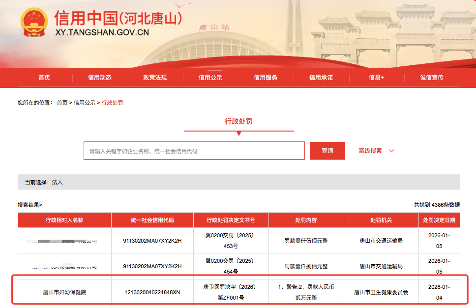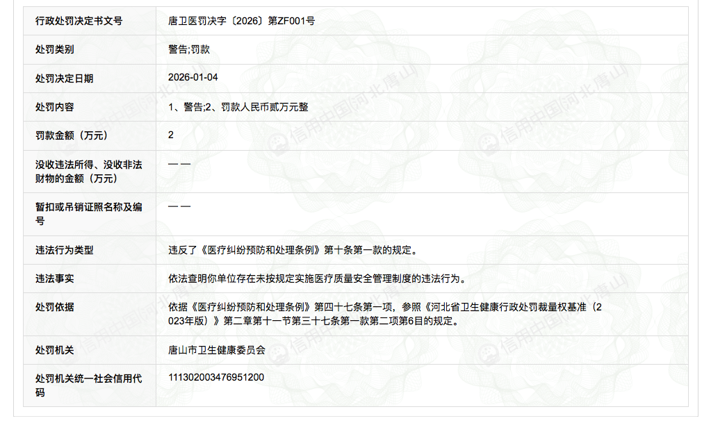 据信用中国(河北唐山)官网公开信息,2026年1月4日,因未按规定实施医疗质量安全管理制度的违法行为,唐山市妇幼保健院被唐山市卫生健康委员会罚款2万元。