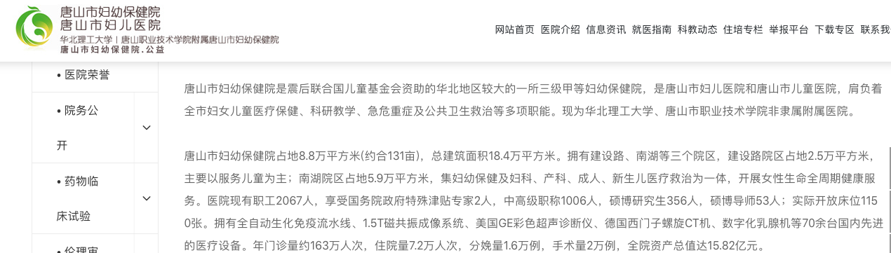 官网介绍,唐山市妇幼保健院是震后联合国儿童基金会资助的华北地区较大的一所三级甲等妇幼保健院。医院现有职工2067人,实际开放床位1150张。年门诊量约163万人次,住院量7.2万人次,分娩量1.6万例,手术量2万例,全院资产总值达15.82亿元。