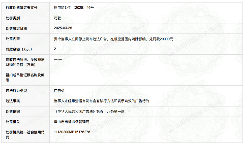 经查询,此前唐山市妇幼保健院还受到过两次行政处罚。2025年3月25日,因未经审查擅自发布含有诊疗方法和表示功效的广告行为,唐山市妇幼保健院被唐山市市场监督管理局处以罚款2万元。