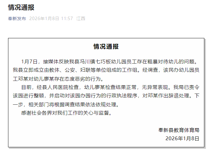 1月7日,接媒体反映奉新县冯川镇七巧板幼儿园员工存在粗暴对待幼儿的问题。奉新县立即成立由教体、公安、妇联等单位组成的工作组。经调查,该民办幼儿园员工邓某对幼儿廖某存在态度恶劣的行为。