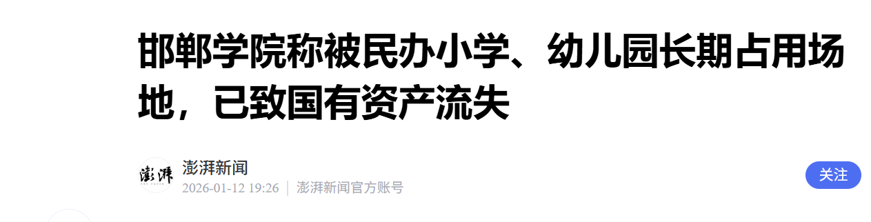 1月12日,邯郸学院公开发布声明,称民办的邯山区学苑幼儿园、邯山区学苑小学违规占用场地且拖欠水、电、暖费用。