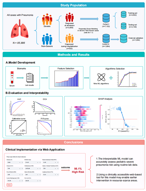 该研究创新构建了一款可解释的机器学习预测模型,仅需整合患儿入院24小时内的11项常规检验指标,即可实现重症肺炎风险的高精度分层预警,标志着在儿科人工智能辅助诊断领域取得新进展,为临床早期识别高危患儿提供了新的高可及性辅助诊断工具。