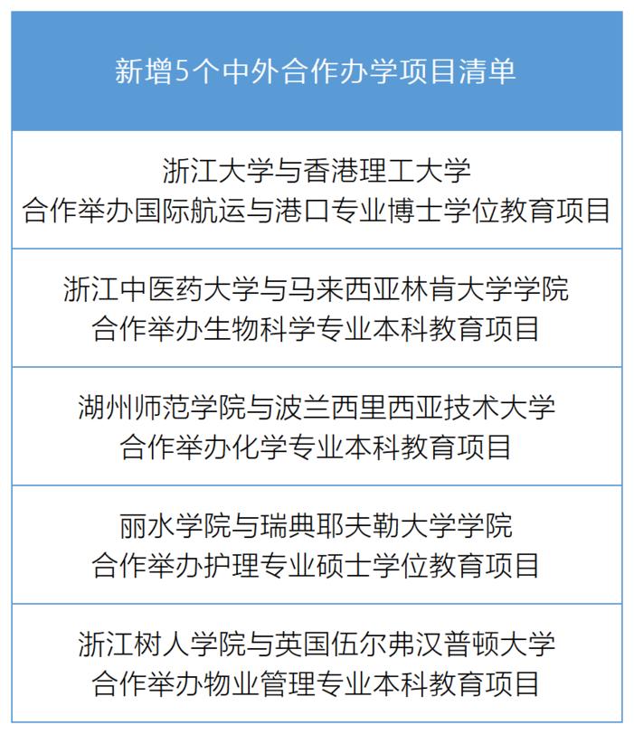 此次,浙江省还新增批准浙江大学与香港理工大学合作举办国际航运与港口专业博士学位教育项目在内的5个中外合作办学项目。具体项目全名单如下↓↓