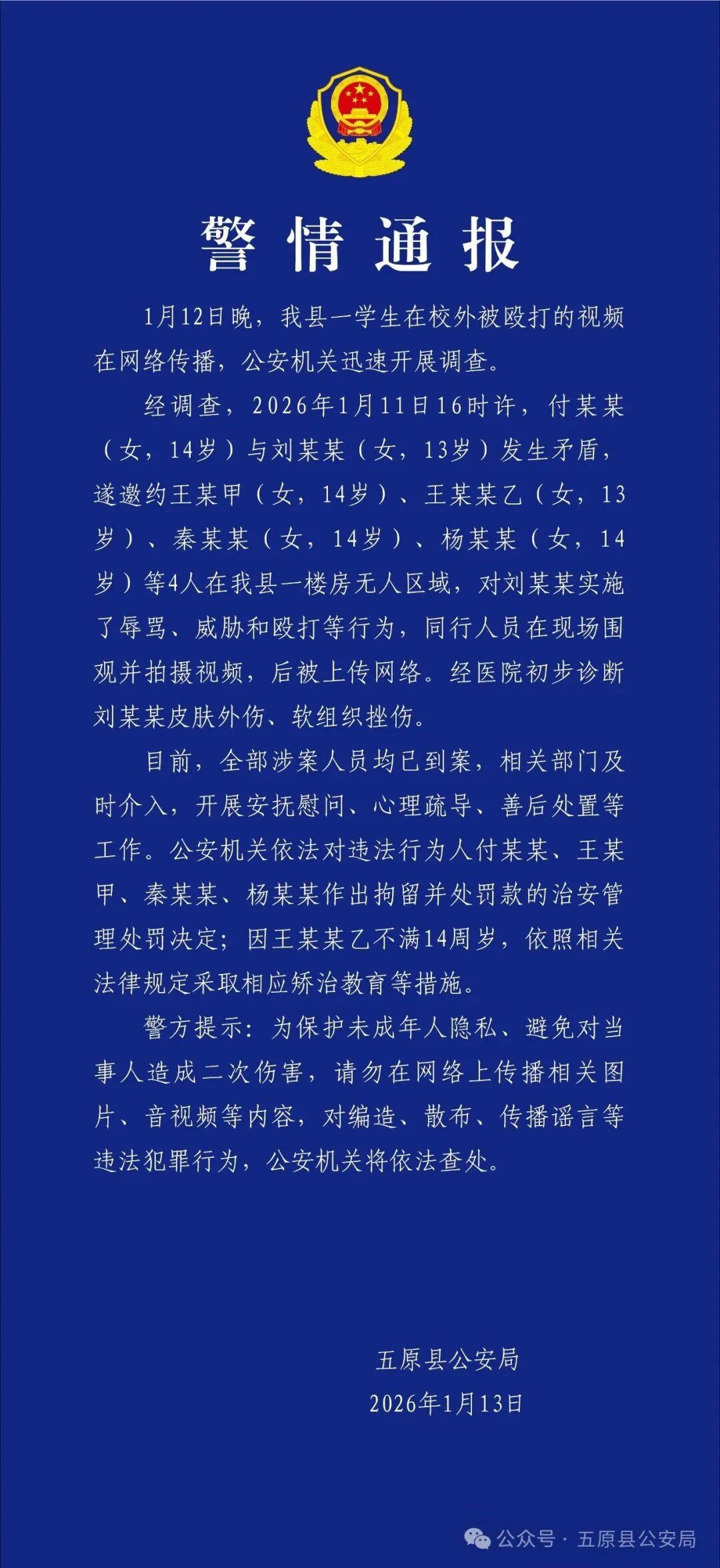 经调查,2026年1月11日16时许,付某某(女,14岁)与刘某某(女,13岁)发生矛盾,遂邀约王某甲(女,14岁)、王某某乙(女,13岁)、秦某某(女,14岁)、杨某某(女,14岁)等4人在五原县一楼房无人区域,对刘某某实施了辱骂、威胁和殴打等行为,同行人员在现场围观并拍摄视频,后被上传网络。经医院初步诊断刘某某皮肤外伤、软组织挫伤。
