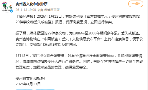 中国网1月13日讯 1月12日,有媒体刊发《官方数据显示:贵州省博物馆老馆29件套文物丢失或被盗》报道,贵州省文化和旅游厅发布通报,表示成立联合调查组,对有关情况进行全面调查核实,并将根据调查情况,依法依规对相关责任人进行严肃处理。