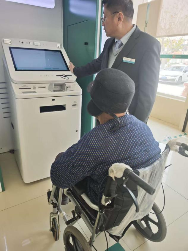 这一幕,被支行的工作人员看在眼里,立刻从便民服务角推来轮椅,快步走到夫妇身边。他小心翼翼地将妻子扶上轮椅,又细心调整好座椅高度,确保她坐得安稳。另一名员工则主动上前,接过丈夫手中的拐杖,轻声询问他们的业务需求。在办理业务的过程中,工作人员不仅耐心地引导夫妇操作,还逐字逐句地为他们讲解流水明细的内容,生怕他们有任何不明白的地方。
