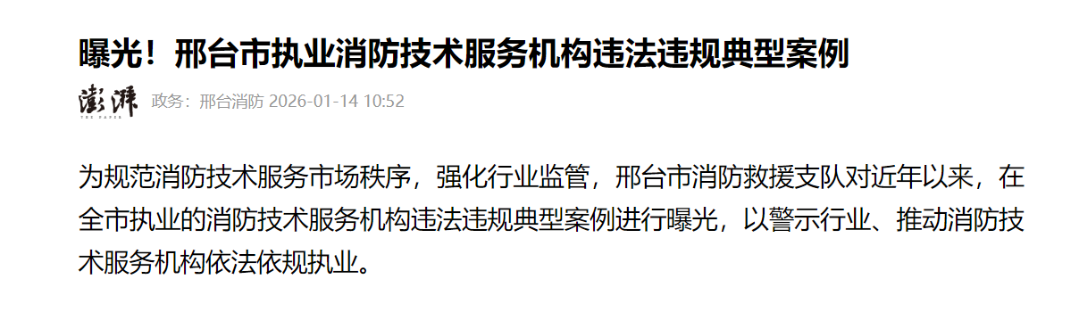 为规范消防技术服务市场秩序,强化行业监管,邢台市消防救援支队对近年以来,在全市执业的消防技术服务机构违法违规典型案例进行曝光,以警示行业、推动消防技术服务机构依法依规执业。