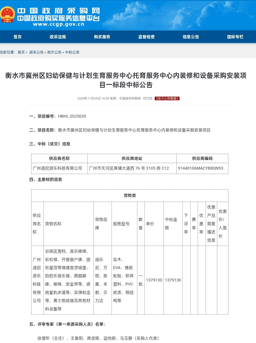 据衡水市冀州区妇幼保健与计划生育服务中心托育服务中心内装修和设备采购安装项目一标段中标公告,供应商为广州迪尼游乐科技有限公司,该项目中标金额1379130元(约137.91万元)。