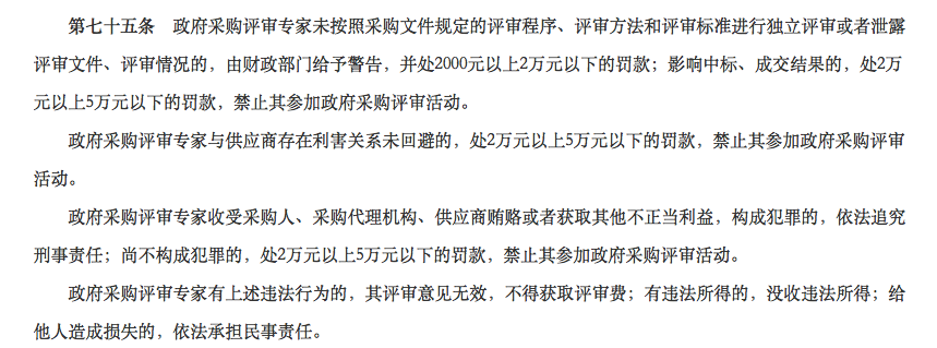 据《中华人民共和国政府采购法实施条例》第七十五条规定:“政府采购评审专家未按照采购文件规定的评审程序、评审方法和评审标准进行独立评审或者泄露评审文件、评审情况的,由财政部门给予警告,并处2000元以上2万元以下的罚款;影响中标、成交结果的,处2万元以上5万元以下的罚款,禁止其参加政府采购评审活动。”