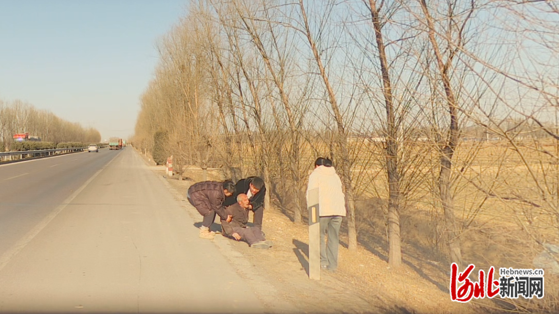 国道上车来车往,寒风凛冽,老人穿着单薄。刘海宽三人一直守在老人身边,细心照料,一等就是半个多小时。“当时就怕老人冻着,更担心他摔到头,就盼着家属赶紧来送他去做检查。”刘海宽说。最终老人的侄子从南宫县城赶来,将老人安全接走就医。