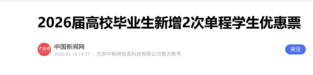 中新网北京1月16日电(记者李京统)记者从中国国家铁路集团有限公司(以下简称“国铁集团”)获悉,2026届高校毕业生将新增2次单程学生优惠票,本学年即可享受6次优惠购票次数。