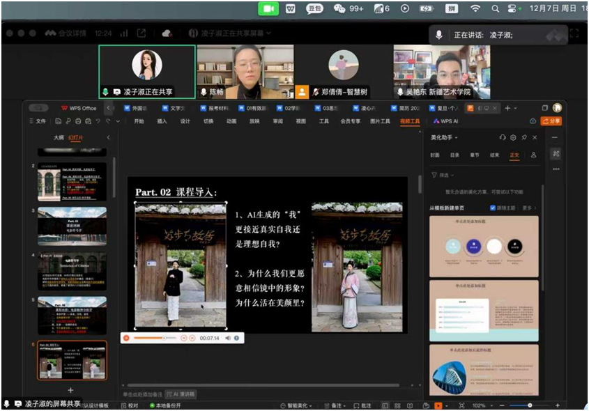 本次公开课进一步升级了温州理工学院《影视美学》课程已有的“双师型”教学模式——该模式此前已在省内课程改革中受到关注,并获得省市级媒体专题报道,取得了良好的教学反响。本次课堂创新引入“三师协同”机制,融合温州理工学院影视理论积淀与影视创作经验,以及新疆艺术学院的地域文化分析优势,打造出“经典影视理论 地方特色文化 前沿行业技术”三重驱动的教学新生态。在此基础上,本次课堂以“教育协同、技术赋能、文化铸魂”为战略导向,构建跨区域教学共同体:服务“教育强国”战略,打造高水平教师协同创新机制;融入“中华民族共同体”建设,促进东西部文化互鉴共融;对接“数字中国”愿景,推进智能技术与教育教学深度融合。