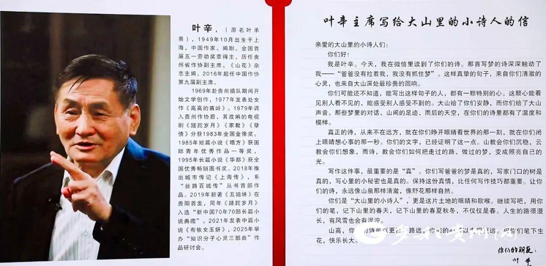 作家叶辛在信的末尾鼓励孩子们:“山高,你们的诗可以更高;路远,你们的心可以走得更远。”如今,这封信被精心装裱,挂在诗歌教室最显眼的位置。周围贴满了孩子们的新作——写团圆的期盼、春节的热闹、长大的梦想。这些留守儿童,用诗歌搭建起通往父母内心的桥梁,也用清澈的语言向世界诉说:即使身在深山,只要心里有诗,就能看见远方。叶辛的信,更加激发了孩子们学习的热情,他们用真诚的诗句表达情感,也倾诉着更多心里话。