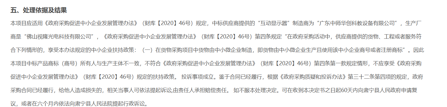 处理结果显示,中标产品“互动显示器”的制造商与生产厂商不一致,导致其商标(商号)所有人与生产主体分离,不符合相关政策关于享受中小企业扶持待遇的规定。
