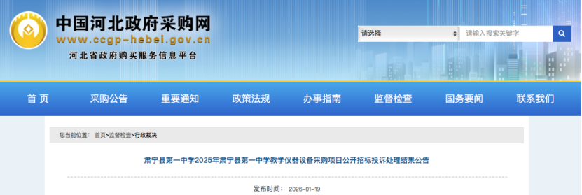 据中国河北政府采购网消息,2026年1月19日,肃宁县财政局就“2025年肃宁县第一中学教学仪器设备采购项目”发布投诉处理结果公告(肃财采投[2026]2号),认定投诉事项成立。公告指出,中标供应商河北现在教学设备有限公司所提供的产品不符合中小企业扶持政策要求。
