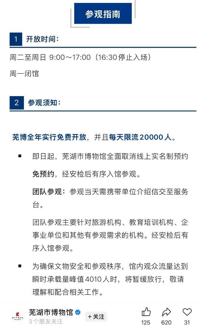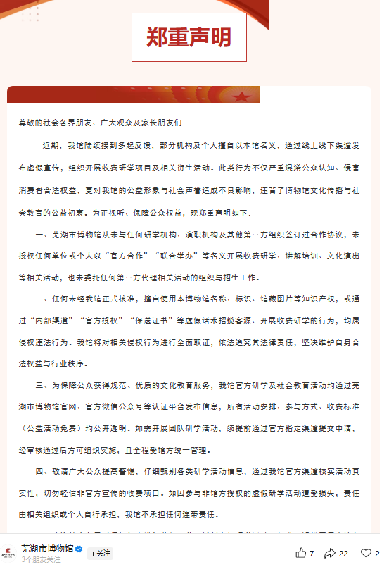 声明中还提到,芜湖市博物馆从未与任何研学机构、演职机构及其他第三方组织签订过合作协议,未授权任何单位或个人以“官方合作”“联合举办”等名义开展收费研学、讲解培训、文化演出等相关活动,也未委托任何第三方代理相关活动的组织与招生工作。任何未经芜湖市博物馆正式核准,擅自使用博物馆名称、标识、馆藏图片等知识产权,或通过“内部渠道”“官方授权”“保送证书”等虚假话术招揽客源、开展收费研学的行为,均属侵权违法行为。博物馆将对相关侵权行为进行全面取证,依法追究其法律责任,坚决维护自身合法权益与行业秩序。