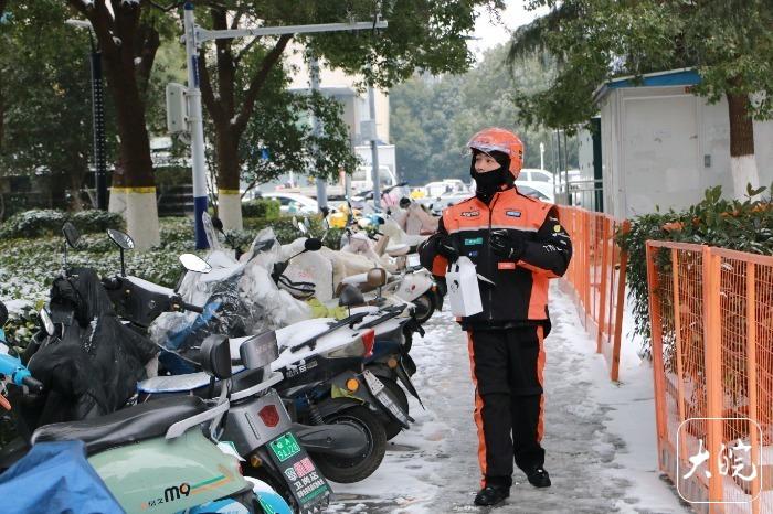大皖新闻讯 “今天中午我在一个商场门口的路牙上,骑得非常慢,但是不知道为啥后轮打滑,结果摔了一跤。”20岁的外卖骑手刘良宇告诉记者,这是他跑外卖以来第一次遇到积雪天气,没想到万分小心还是摔了跤。“幸好当时手里没餐,没造成餐损,不需要赔钱。”