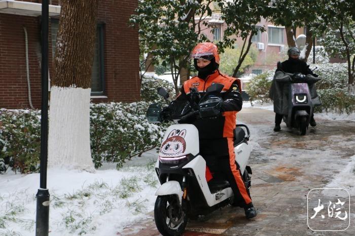 作为入职半年的新人骑手,下雪之前,刘良宇的前辈们给他传授了不少技巧。“保暖就是要多穿一点,我今天穿了五层。”刘良宇拍着身上的棉服说:“防滑要给车轮上防滑链,但最好是骑慢一点。”