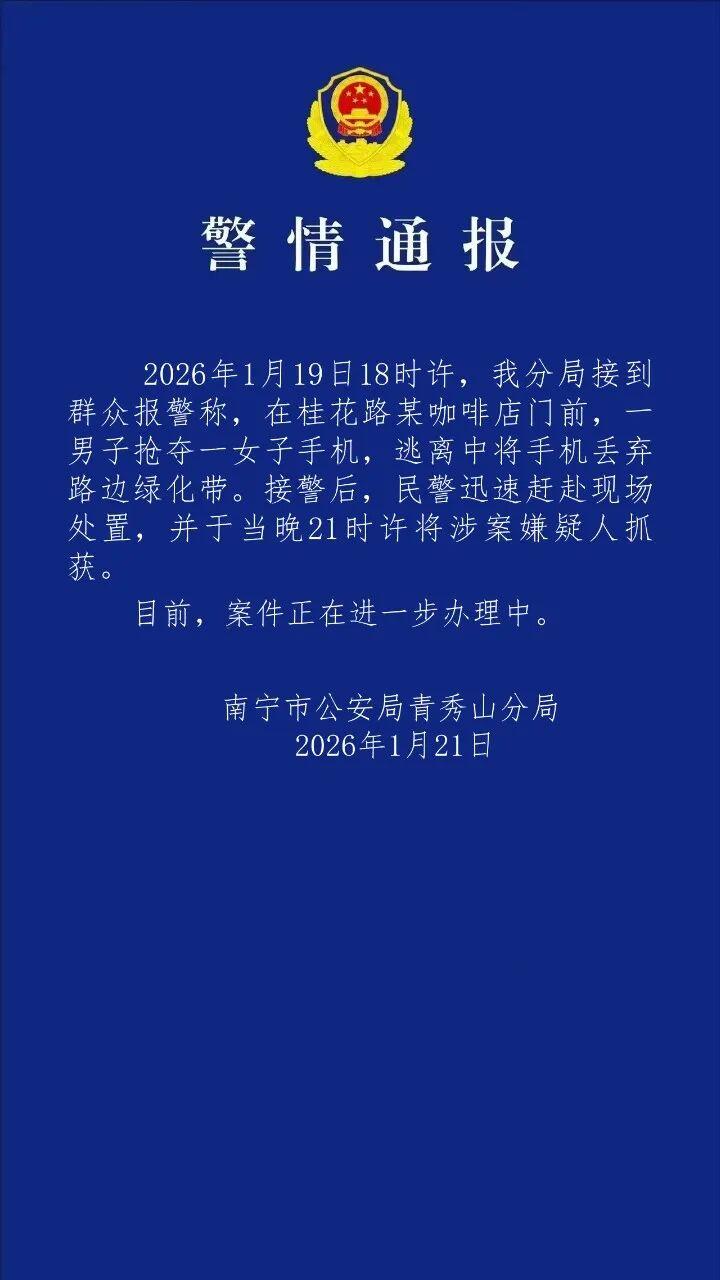 中国网1月21日讯据青秀山警方微信公众号消息,1月21日,南宁市公安局青秀山分局发布警情通报。1月19日18时许,南宁市公安局青秀山分局接到群众报警称,在桂花路某咖啡店门前,一男子抢夺一女子手机,逃离中将手机丢弃路边绿化带。接警后,民警迅速赶赴现场处置,并于当晚21时许将涉案嫌疑人抓获。目前,案件正在进一步办理中。