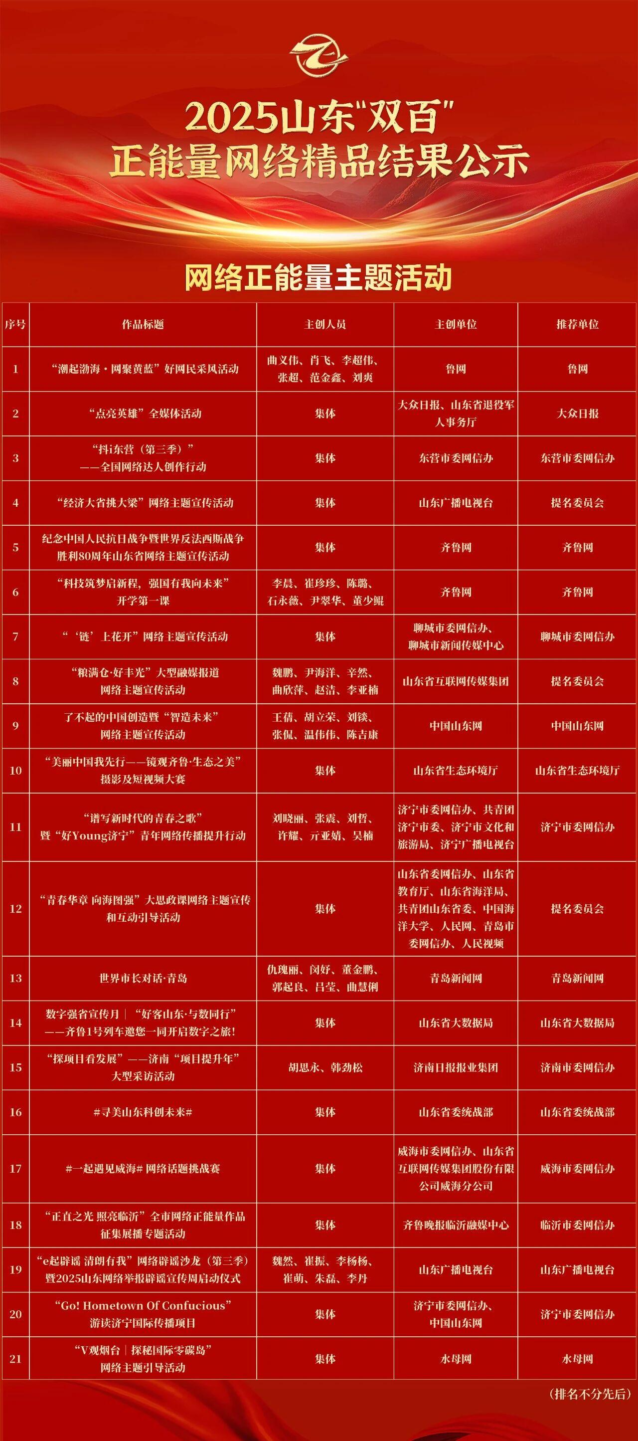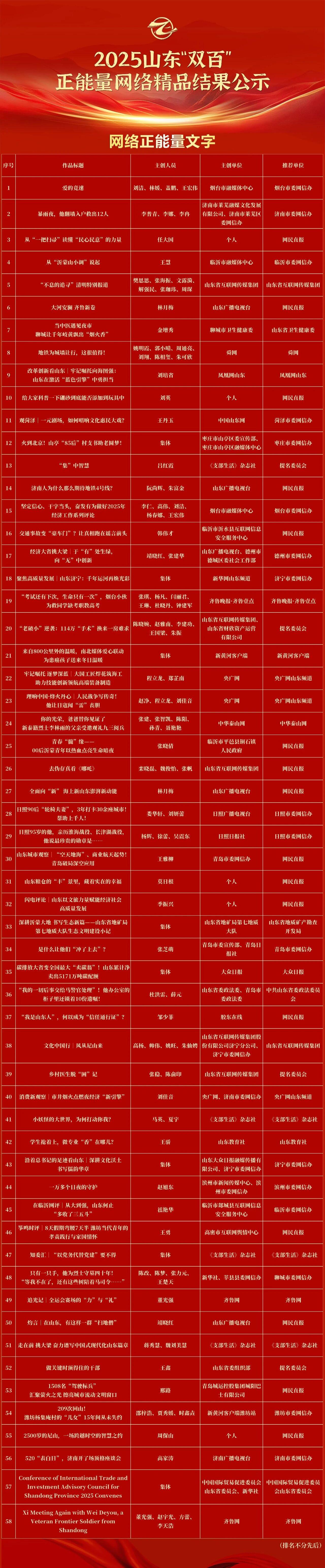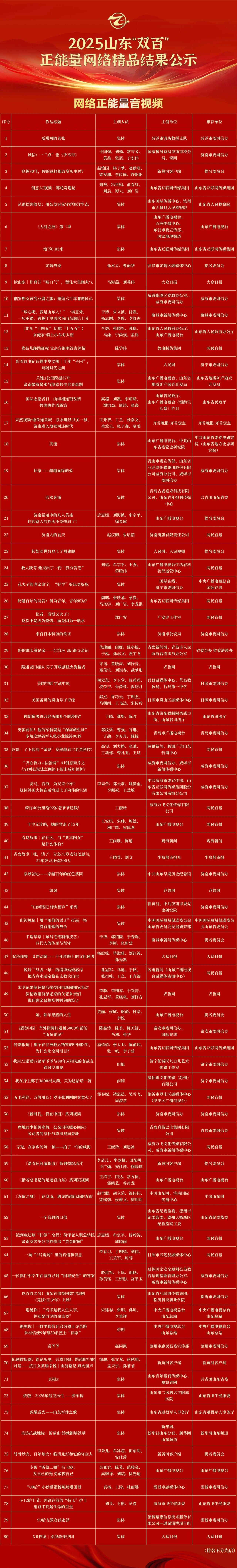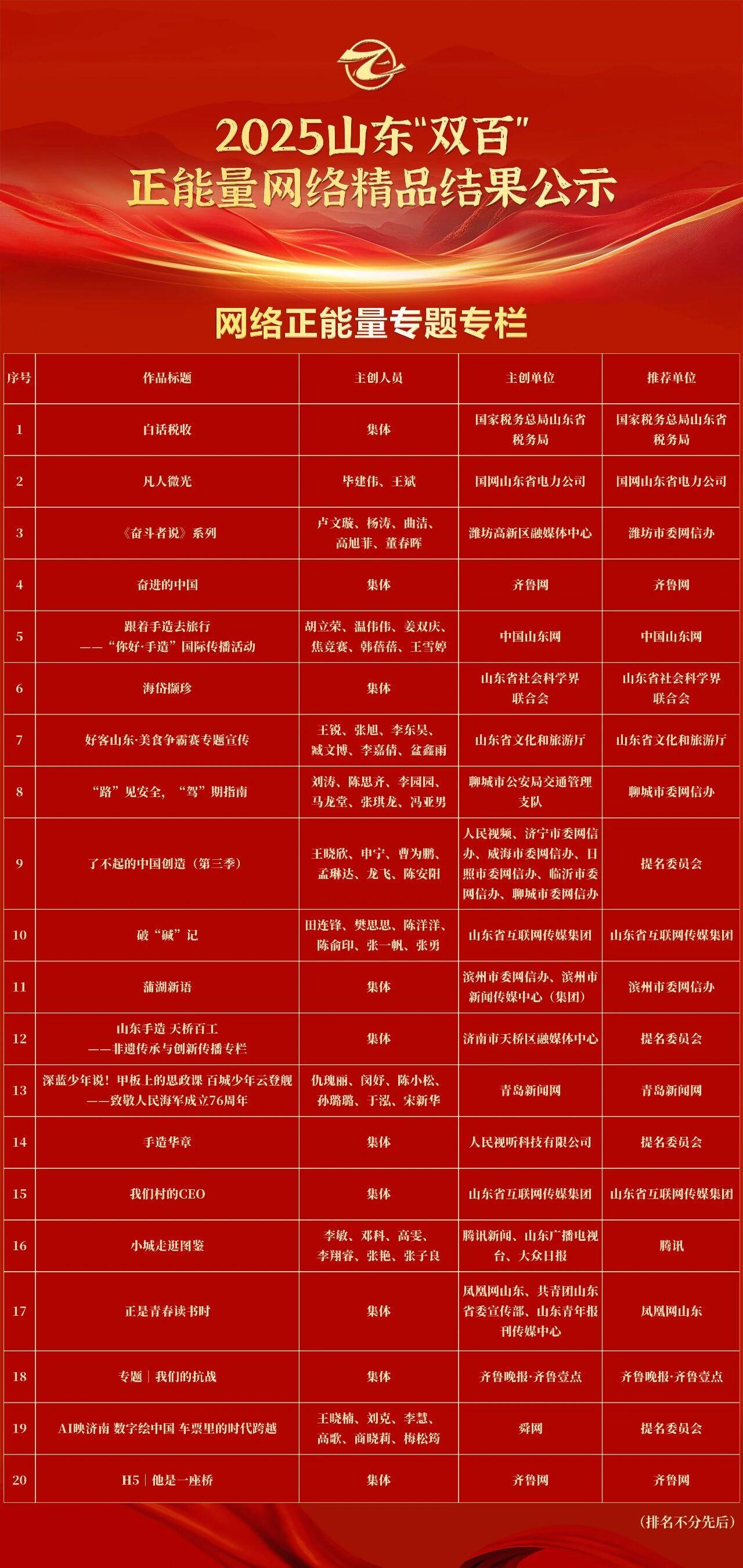 鲁网1月21日讯1月16日,山东省新媒体协会微信公众号发布公告,对2025山东“双百”正能量网络精品征集展播活动拟入选作品进行公示。其中,《“‘链’上花开”网络主题宣传活动》《了不起的中国制造(第三季)》《手造华章丨东昌毛笔制作技艺:四代人的传承与坚守》《“路”见安全,“驾”期指南》《只有一只手,他为烈士守墓四十年!“等我不在了,还有这些树陪着马司令……”》《“放心吧,我是山东人!”一场意外,一句承诺,跨越千里再次为山东诚信上分》《当中医遇见夜市 聊城让千年岐黄飘出“烟火香”》等9个聊城市网络正能量作品拟入选2025山东“双百”正能量网络精品,数量位居全省前列。公示期满后,将根据最终结果进行线上集中展播。